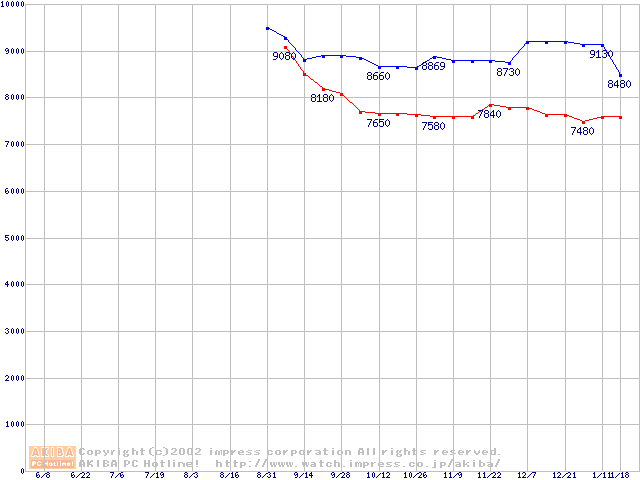 | [↑前グラフ]: | DiamondMax Plus 9 (7200rpm,2MB,UltraATA/133,FDB)の最安値推移 |