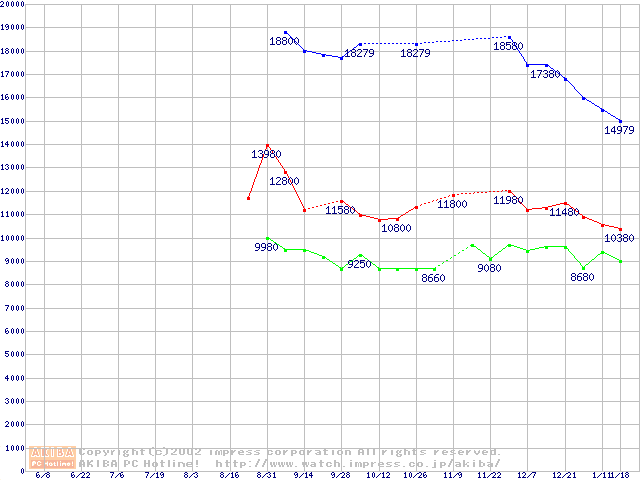 | [↑前グラフ]: | DiamondMax 16 (5400rpm,UltraATA/133,2MB,80GB/Platter,BB)の最安値推移 |