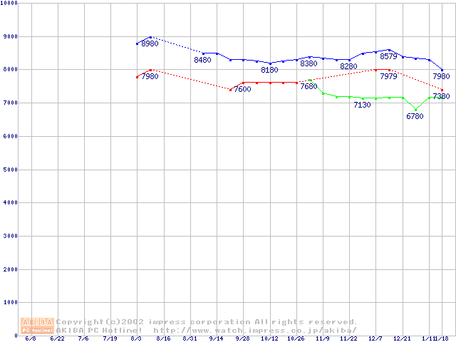 | [↑前グラフ]: | DiamondMax D540X-4G (5400rpm,UltraATA/133,40GB/Platter)の最安値推移 |