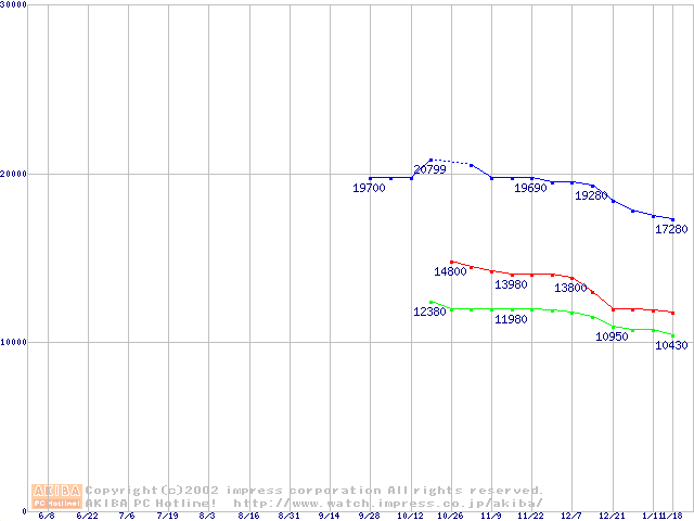 | [↑前グラフ]: | Barracuda ATA V (7200rpm,UltraATA/100,8MB.60GB/Platter,FDB)の最安値推移 |