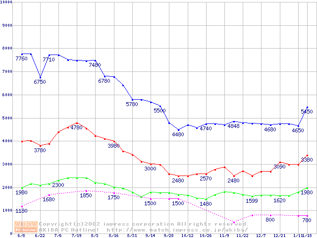 | [↓次グラフ]: | PC133 SDRAM DIMM CasLatency=2の最安値推移 |