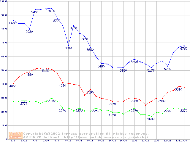 | [↑前グラフ]: | PC133 SDRAM DIMM CasLatency=3の最安値推移 |