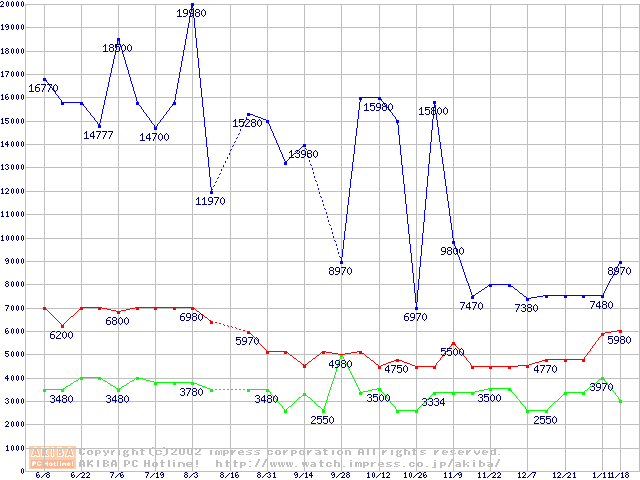 | [↑前グラフ]: | PC133 SDRAM DIMM CasLatency=2の最安値推移 |