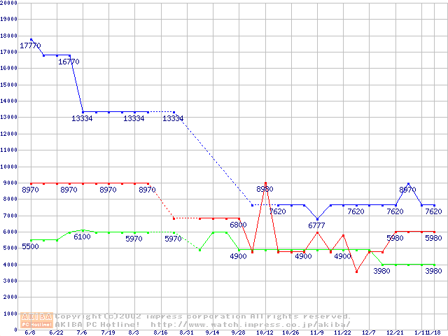 | [↓次グラフ]: | PC800-40 DRDRAM RIMMの最安値推移 |
