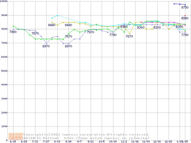 | [↑前グラフ]: | HDD 30GB~40GB未満(5400rpmクラス)の最安値推移 |