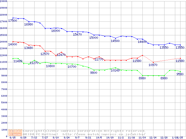 | [↑前グラフ]: | MKシリーズ (9.5mm,4200rpm,2MB,FDB,20GB/Platter)の最安値推移 |