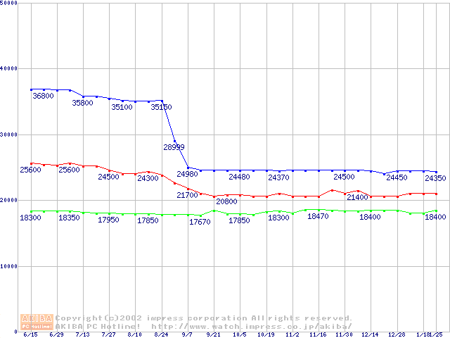 | [↑前グラフ]: | Socket 478 (micro-PGA,FSB 400MHz,L2 128KB,Willamette)の最安値推移 |