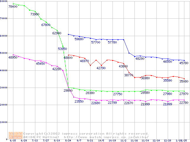 | [↑前グラフ]: | Socket 478 (micro-PGA,FSB 533MHz,L2 512KB,Hyper-Threading,Northwood)の最安値推移 |