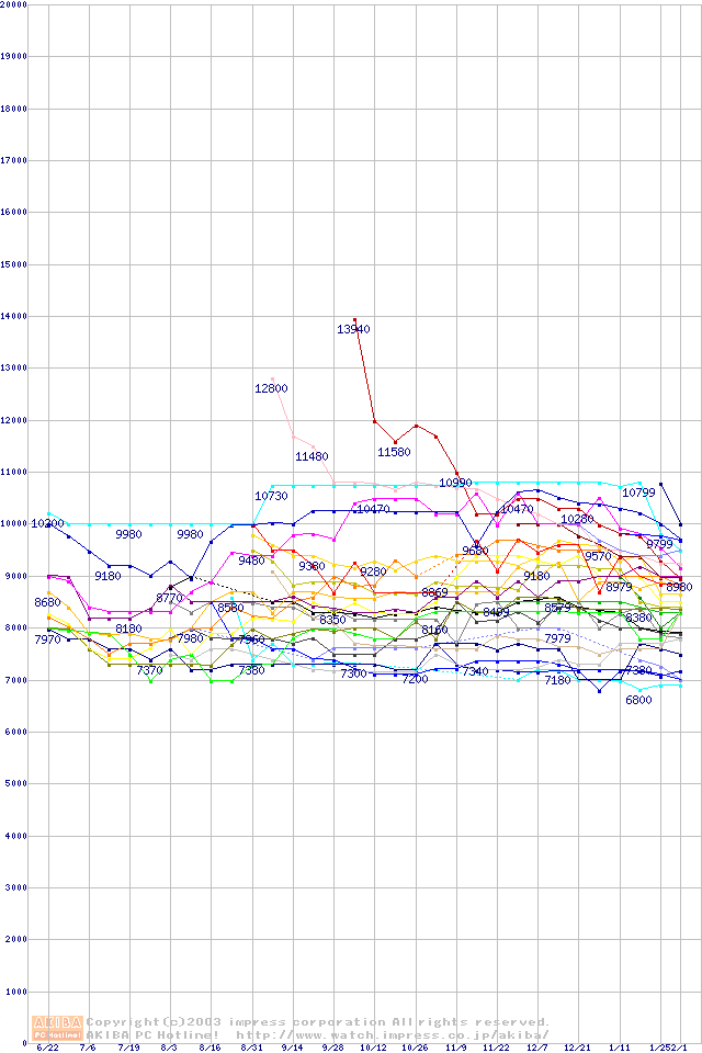 HDD主要製品(最安値1万円~1万5千円未満)の最安値推移