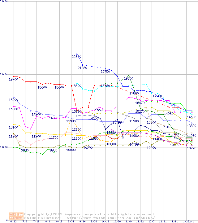 HDD主要製品(最安値1万5千円~2万円未満)の最安値推移
