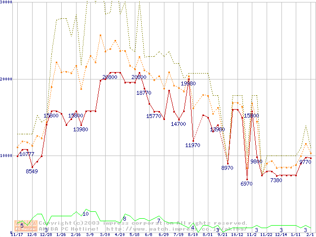 PC133 SDRAM DIMM CasLatency=3 ECC対応の最安値推移