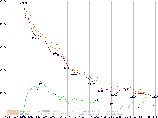 Socket A (OPGA,FSB 266MHz,L2 256KB,Palomino)の最安値推移