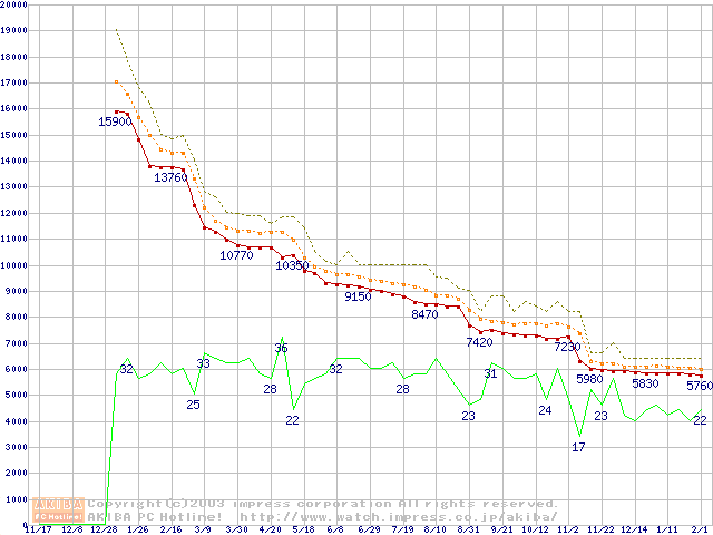 Socket 370 (FC-PGA2,FSB 100MHz,L2 256KB,Tualatin)の最安値推移