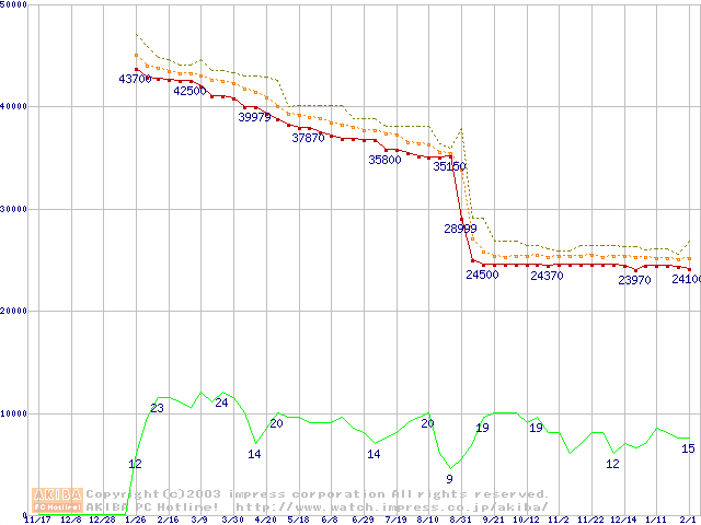 Socket 370 (FC-PGA2,FSB 133MHz,L2 512KB,Tualatin)の最安値推移
