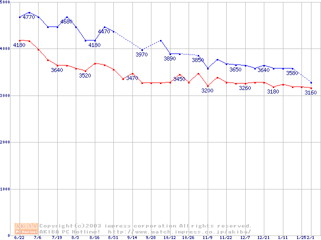 | Socket A (PGA,FSB 200MHz,L2 64KB,Spitfire)の最安値推移 |