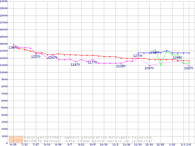 | [↑前グラフ]: | 2.5インチHDD 20GB~30GB未満(9.5mm厚)の最安値推移 |