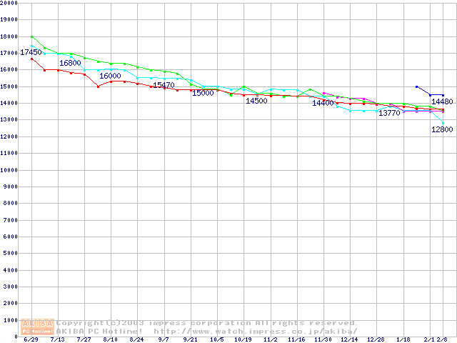 | [↑前グラフ]: | 2.5インチHDD 30GB~40GB未満(9.5mm厚)の最安値推移 |