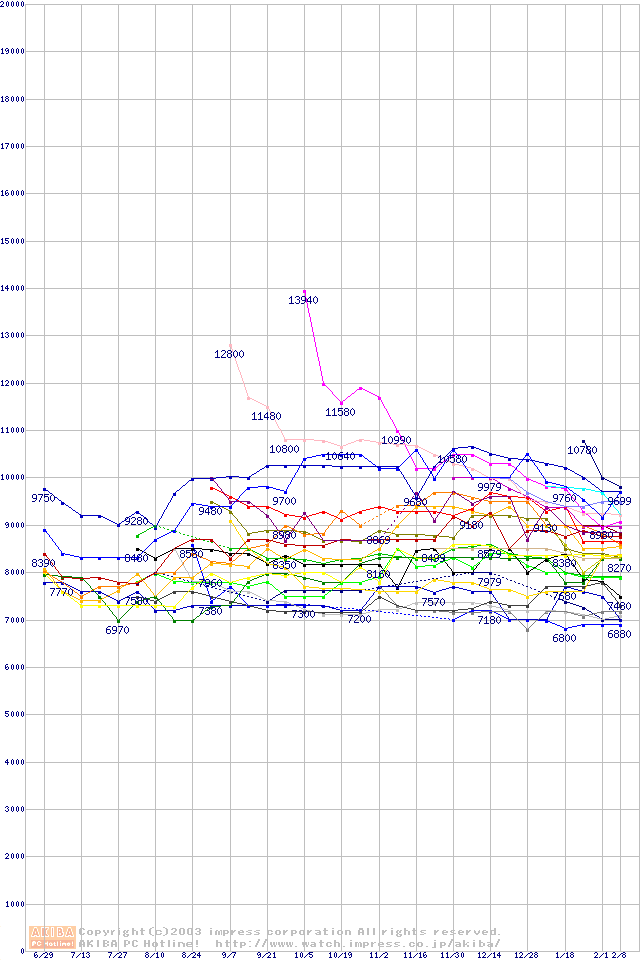 HDD主要製品(最安値1万円~1万5千円未満)の最安値推移