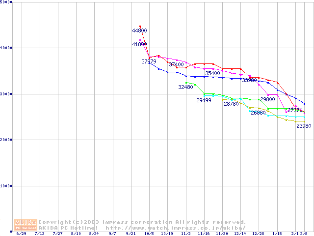 | [↓次グラフ]: | HDD 200GB以上(7200rpmクラス)の最安値推移 |