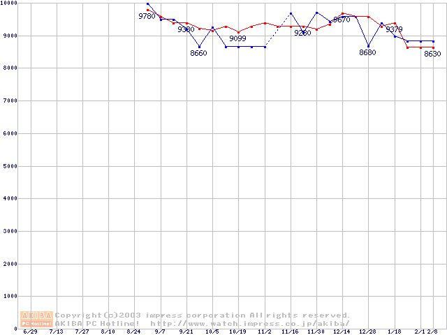 | [↑前グラフ]: | HDD 40GB~50GB未満(5400rpmクラス)の最安値推移 |