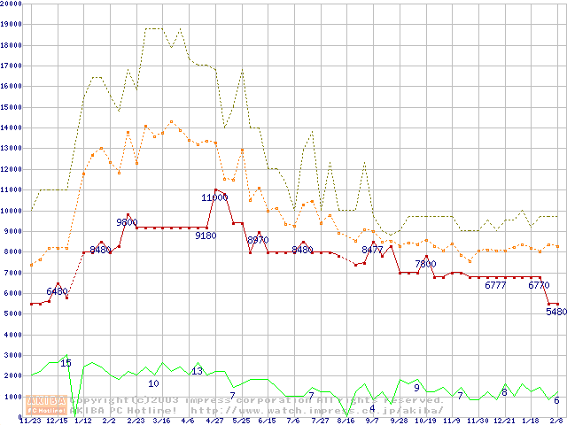 PC133 SDRAM DIMM CasLatency=3 ECC対応 Registeredタイプの最安値推移