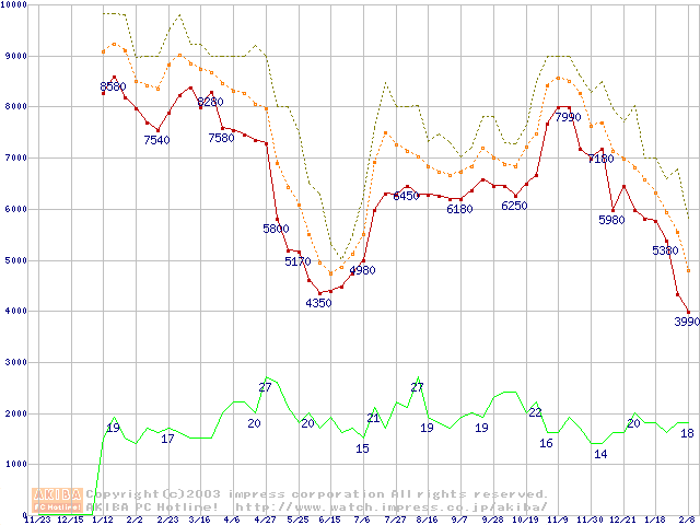 PC2100(DDR266) DDR SDRAM DIMM(CL 2.0)の最安値推移