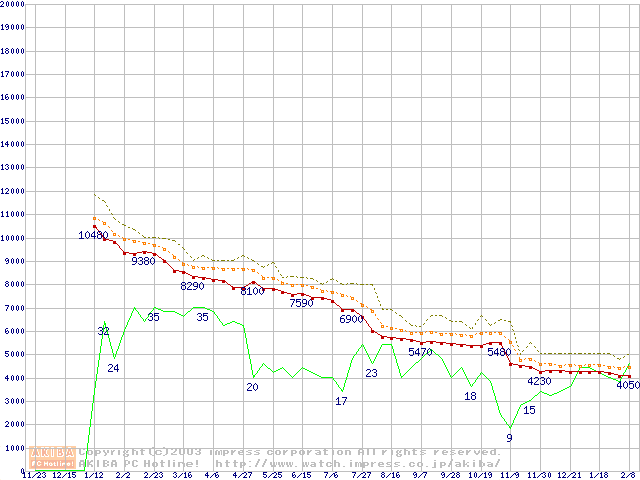 Socket 370 (FC-PGA2,FSB 100MHz,L2 256KB,Tualatin)の最安値推移