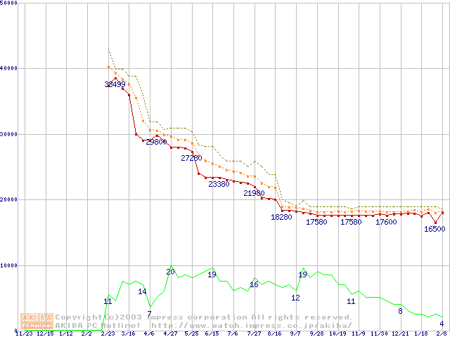 Socket A (OPGA,FSB 266MHz,L2 256KB,Palomino)の最安値推移