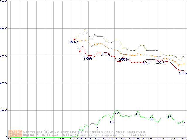 メモリ主要製品(最安値1万円以上)の最安値推移