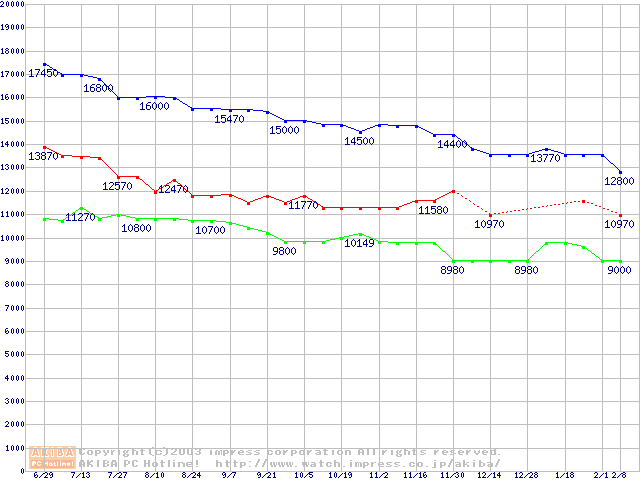 | [↑前グラフ]: | MKシリーズ (9.5mm,4200rpm,2MB,FDB,20GB/Platter)の最安値推移 |