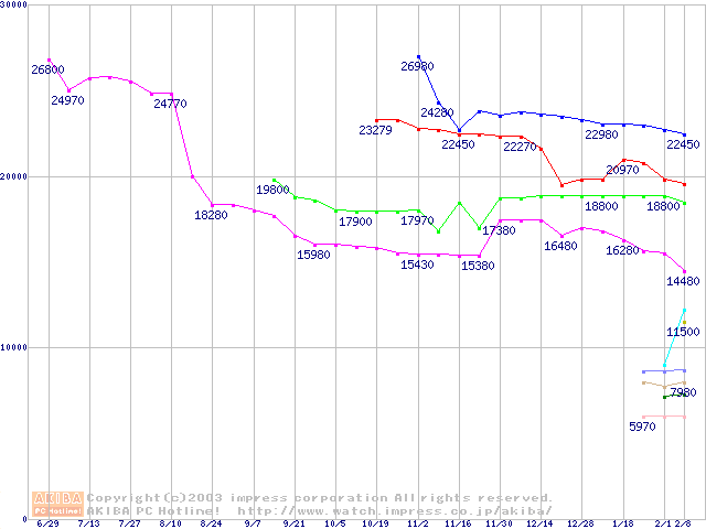 | [↑前グラフ]: | Socket A (OPGA,FSB 333MHz,L2 256KB,Thoroughbred)の最安値推移 |