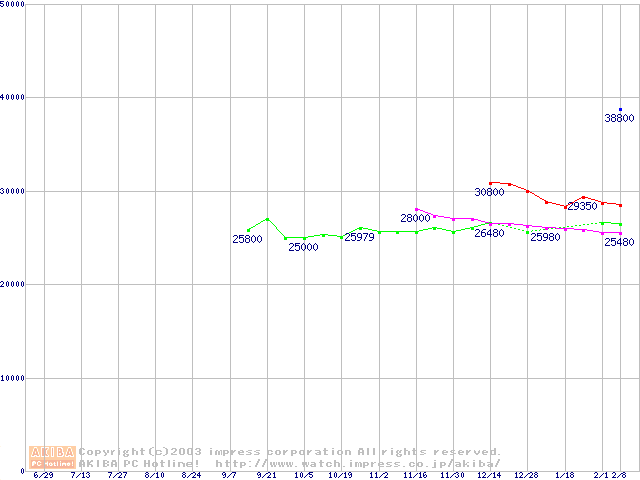 | Socket A (OPGA,FSB 266MHz,L2 256KB,Thoroughbred)の最安値推移 |