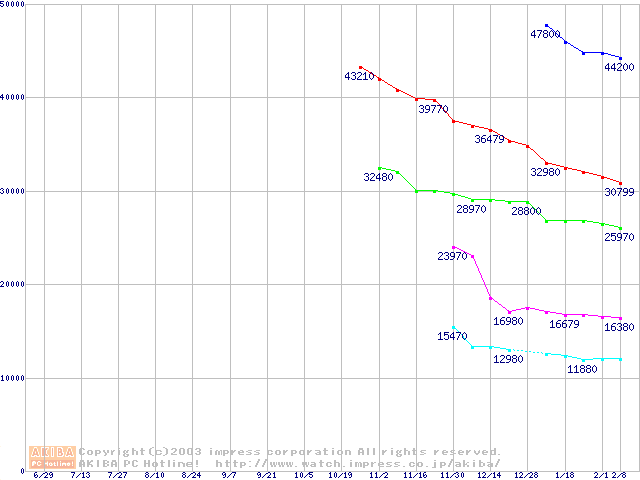 | [↑前グラフ]: | Deskstar 120GXP (7200rpm,2MB,UltraATA/100,BB)の最安値推移 |