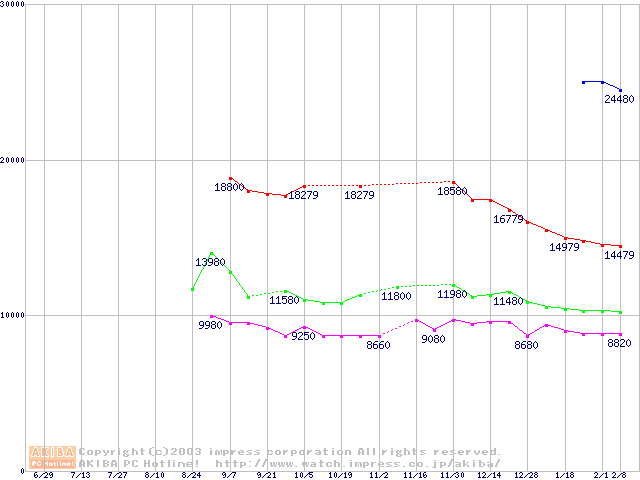 | [↑前グラフ]: | DiamondMax 16 (5400rpm,UltraATA/133,2MB,80GB/Platter,BB)の最安値推移 |