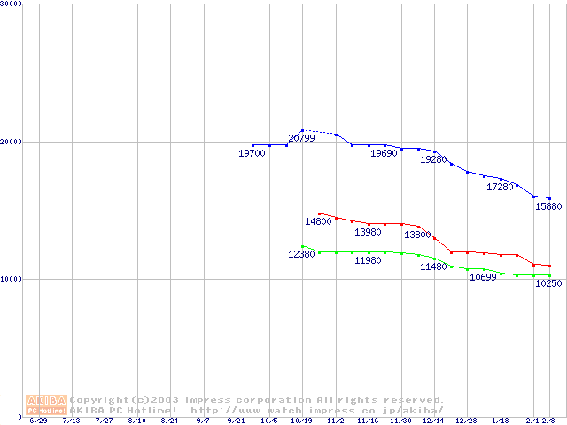 | [↓次グラフ]: | Barracuda ATA IV (7200rpm,UltraATA/100,2MB,40GB/Platter,FDB)の最安値推移 |