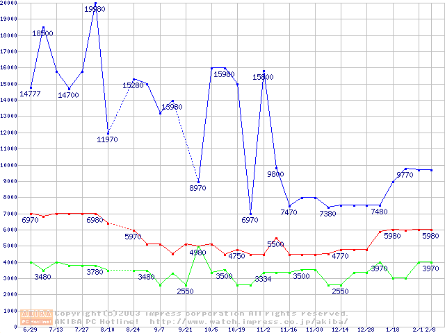 | [↑前グラフ]: | PC133 SDRAM DIMM CasLatency=2の最安値推移 |