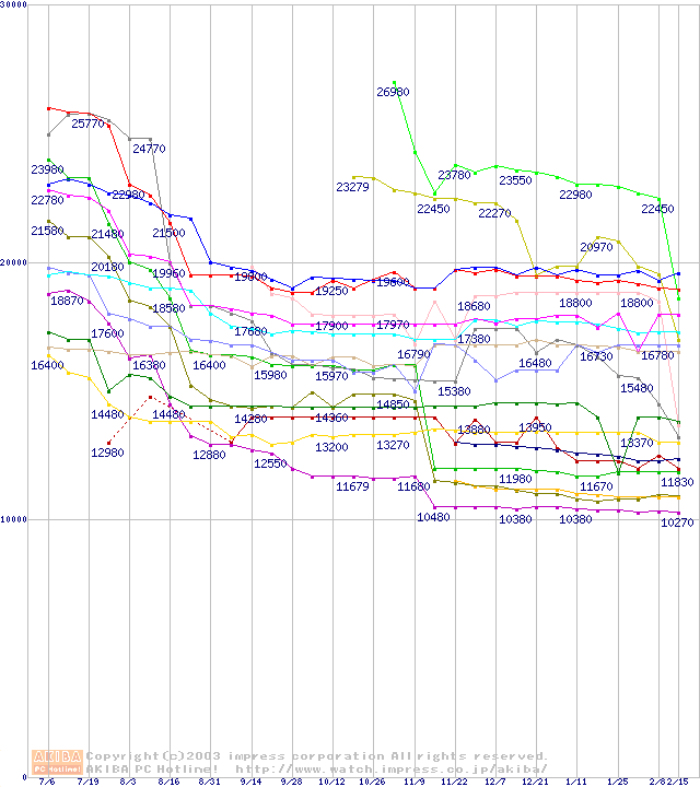 CPU主要製品(最安値2万円~3万円未満)の最安値推移