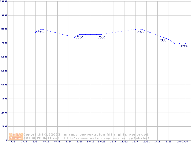 | [↑前グラフ]: | HDD 20GB~30GB未満(5400rpmクラス)の最安値推移 |
