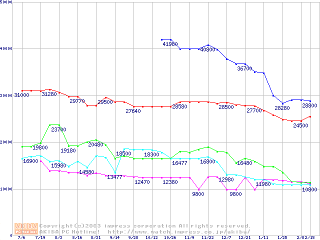メモリ主要製品(最安値1万円以上)の最安値推移