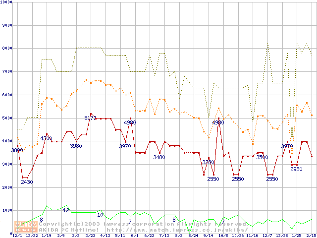 PC133 SDRAM DIMM CasLatency=3 ECC対応の最安値推移