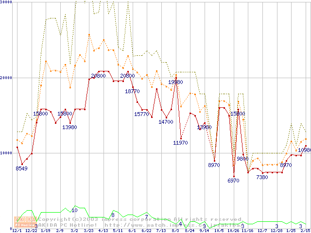 PC133 SDRAM DIMM CasLatency=3 ECC対応の最安値推移