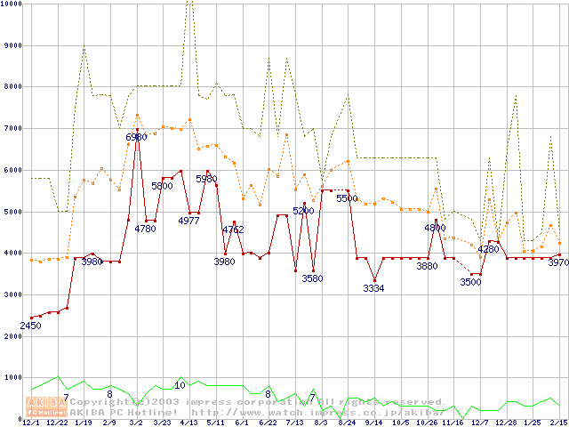 PC100 SDRAM DIMM CasLatency=2 ECC対応の最安値推移