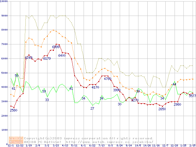 PC100 SDRAM DIMM CasLatency=2の最安値推移