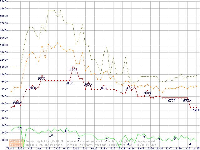 PC133 SDRAM DIMM CasLatency=3 ECC対応 Registeredタイプの最安値推移