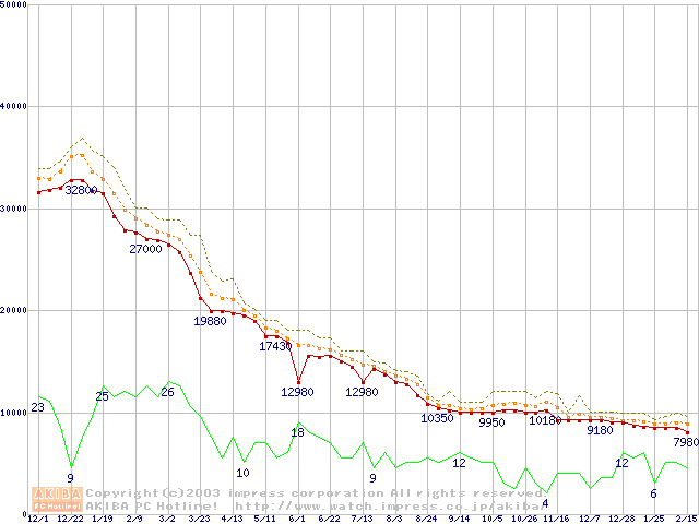 Socket A (OPGA,FSB 266MHz,L2 256KB,Palomino)の最安値推移