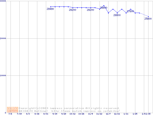 | [↑前グラフ]: | MHRシリーズ (9.5mm,4200rpm,UltraATA/100,2MB,FDB,20GB/Platter)の最安値推移 |
