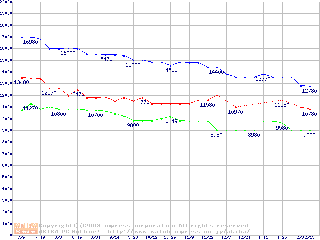 | [↑前グラフ]: | MKシリーズ (9.5mm,4200rpm,2MB,FDB,20GB/Platter)の最安値推移 |