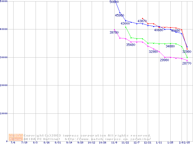 | Socket A (OPGA,FSB 333MHz,L2 256KB,Thoroughbred)の最安値推移 |