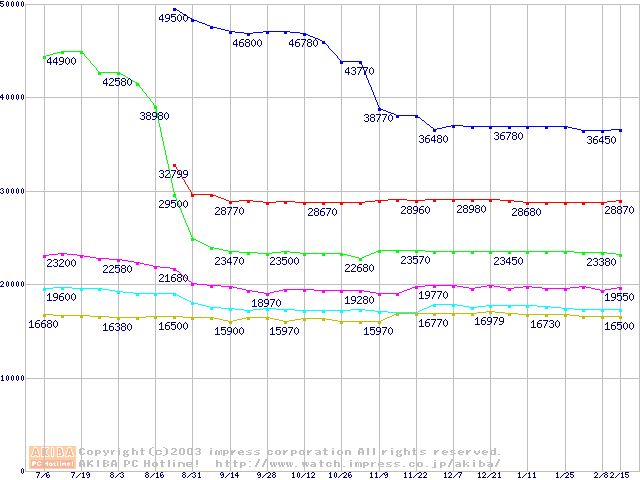 | [↑前グラフ]: | Socket 478 (micro-PGA,FSB 533MHz,L2 512KB,Northwood)の最安値推移 |