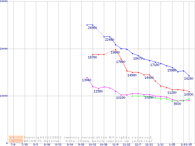 | [↑前グラフ]: | Deskstar 180GXP (7200rpm,8MB,UltraATA/100,FDB)の最安値推移 |